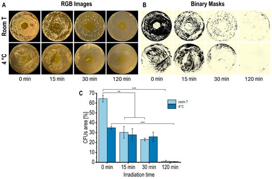 (A) RGB images, (B) corresponding binary masks, and (C) quantification of CFU coverage area (%) in Petri dishes with CS/RF film incubated at room temperature (for 48 h) and at 4 °C (for 120 h) and exposed to blue LED light for varying durations. Data in the bar chart are presented as mean ± standard deviation (error bars) of n = 3 (** p < 0.01, *** p < 0.001).