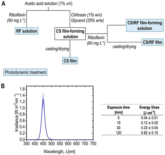 Films CS and CS/RF were prepared by the solvent casting method with slight modifications [52]. The degassed film-forming solutions (i.e., CS and CS/RF) were poured into glass molds (10 cm × 10 cm × 0.3 cm) and dried under the hood at room temperature, protected from light, for 48 h. The resulting CS and CS/RF films were removed from the molds and stored in a light-protected desiccator at 23 °C and 50% relative humidity for at least 48 h according to ISO 187:2022 [60], to ensure moisture equilibration in the films before analyses. Figure 9A shows an overview of the experimental setup, highlighting sample names as referred to throughout the following sections, and the stages where the photodynamic treatment was applied to investigate the photochemical properties of RF in both solutions and films.