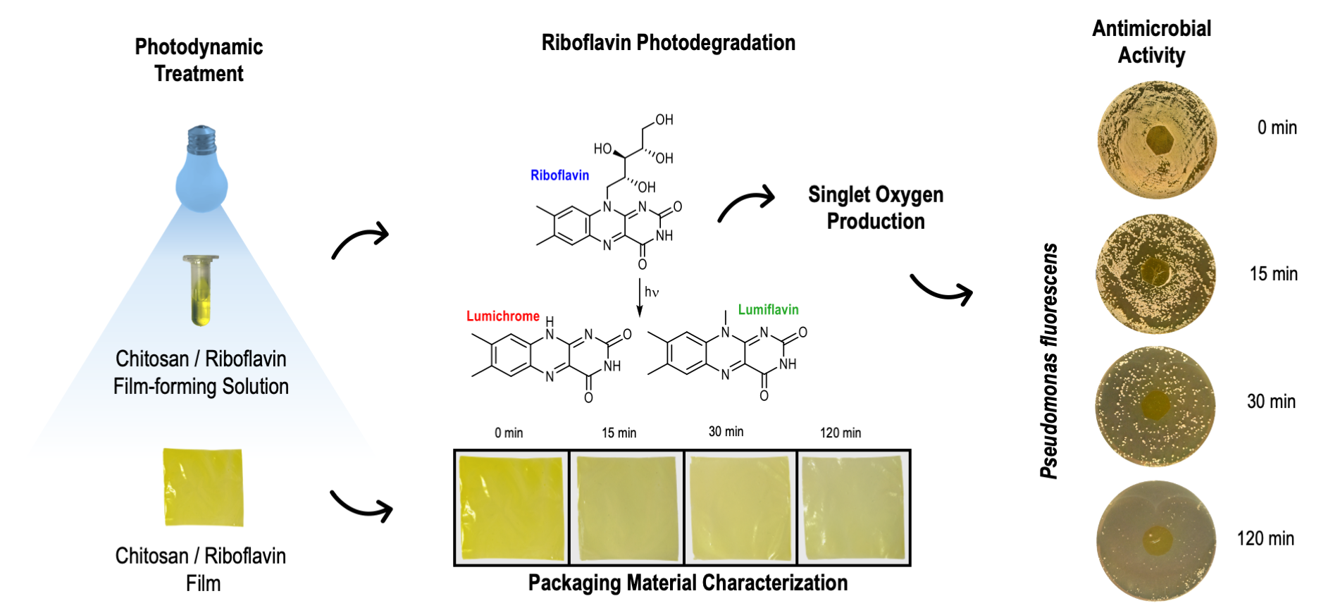 - Su, L.; Huang, J.; Li, H.; Pan, Y.; Zhu, B.; Zhao, Y.; Liu, H. Chitosan-Riboflavin Composite Film Based on Photodynamic Inactivation Technology for Antibacterial Food Packaging. Int. J. Biol. Macromol. 2021, 172, 231–240. [Google Scholar] [CrossRef] [PubMed]