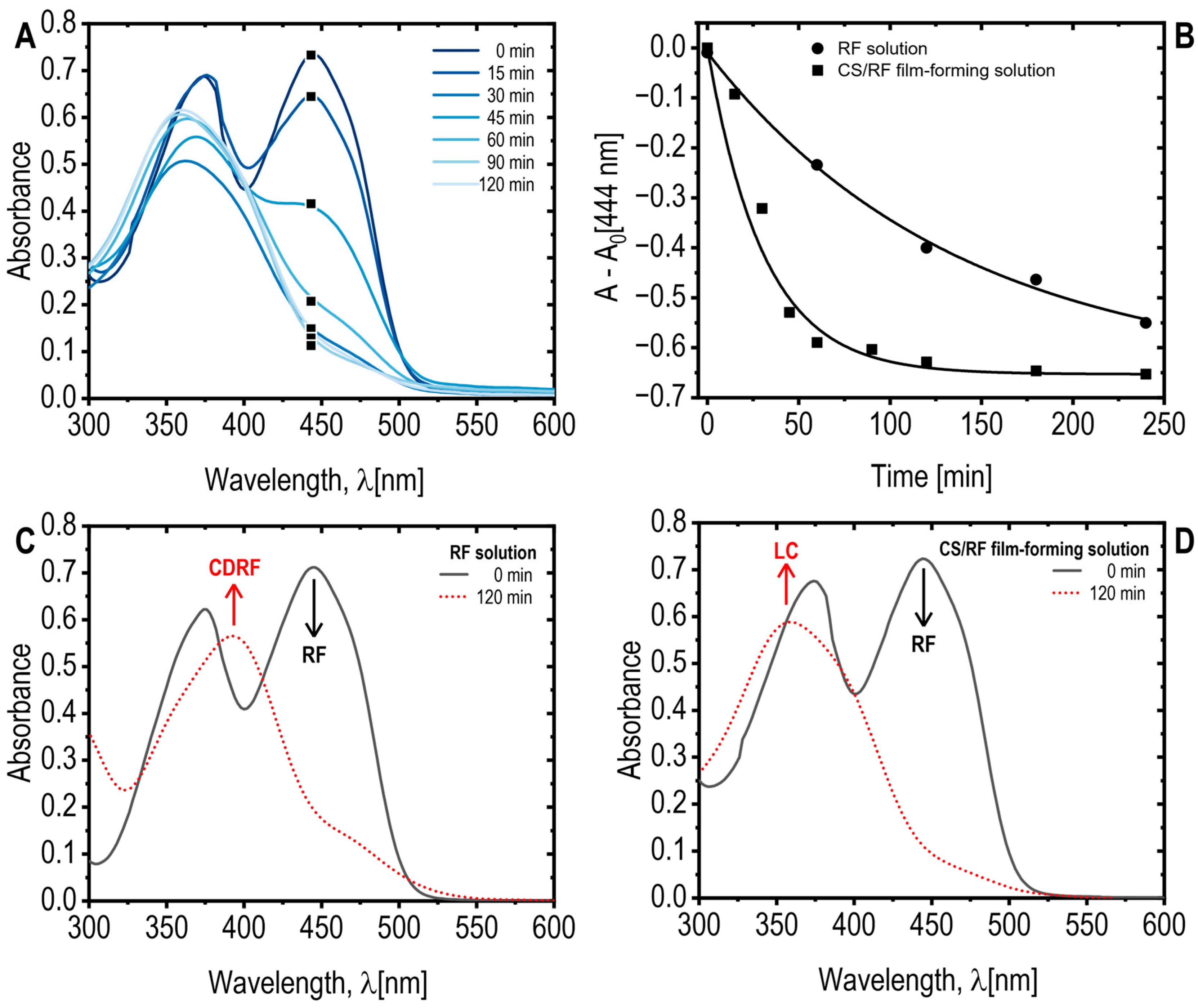 3.4. Study of Riboflavin Photodegradation in Film-Forming Solutions