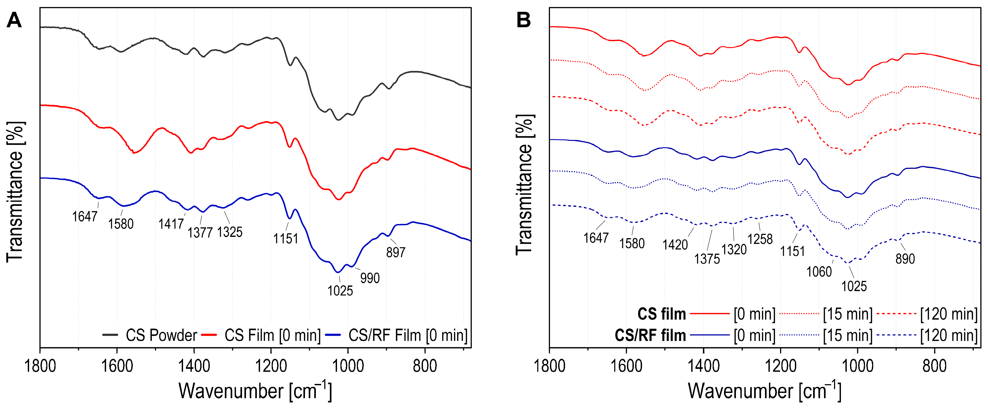 2.4. Antimicrobial Activity of CS/RF Films: In Vitro Evaluation