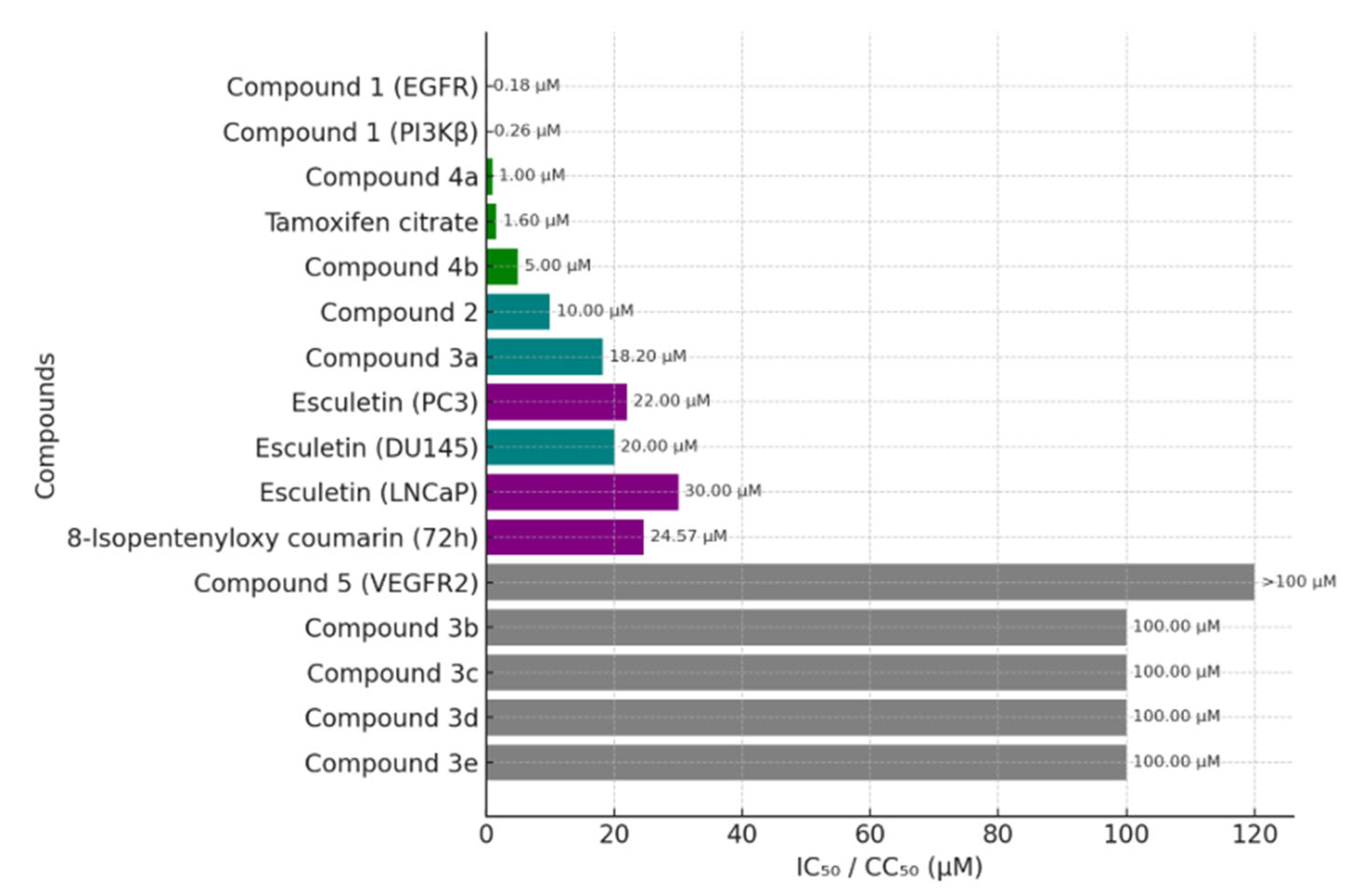 | 7-substituted multitarget coumarins | EGFR; aromatase (CYP19A1) | MDA-MB-231 > MCF-7 | MDA-MB-231 IC50 ≈ 1.9–3.5 µM; MCF-7 IC50 ≈ 3.9–6.0 µM | Apoptosis; G0/G1 or S arrest | [64] |