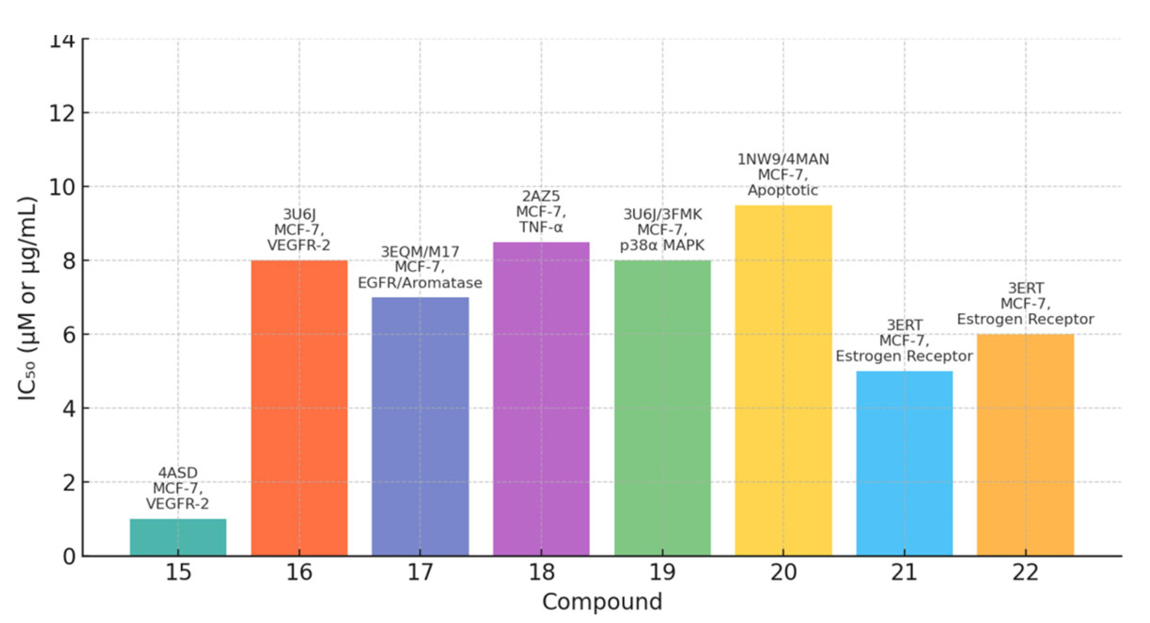 6.8. Coumarin–1,3,4-Oxadiazole Hybrids as Estrogen-Receptor Modulators in Breast Carcinoma (MCF-7, MDA-MB-231; PDB: 3ERT)