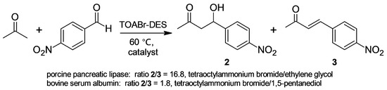 In contrast, m- and p-nitrobenzaldehyde gave mixtures of the corresponding ketol and enone, which were only slightly enriched in the ketol. Computational experiments on BSA structural analysis and molecular docking of the assayed substrates were carried out in the zone of the BSA-binding site IIA containing Lys-222. Interestingly, only the nitrobenzaldehydes showed absence of contacts with the residues of the explored cavity [29]. Holtmann and coworkers [30] studied the reaction of acetone and p-nitrobenzaldehyde catalyzed by promiscuous biocatalysts in deep eutectic solvents (DES) at different temperatures (Figure 2). In the assayed DES (choline chloride/glycerol, tetraoctylammonium bromide (TOABr)/ethylene glycol (EG), and TOABr/1,5-pentanediol (PD)), BSA did not allow for selective catalysis; in both TOABr-DES, it led to mixtures of ketol 2 and enone 3, which were again only slightly enriched in the ketol. However, in TOABr/EG, porcine pancreatic lipase (PPL) catalyzed the highly selective formation of ketol 2, exhibiting selectivity complementary to BSA.