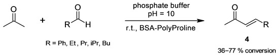 Recently, Zhang and coworkers [32] applied transfer radical polymerization to prepare a proline-based conjugate from BSA and grafted a polymer bearing L-proline moieties onto the surface of albumin. The conjugate (BSA–PolyProline) was assayed at pH 10 and room temperature in the cross-aldol condensation of acetone and a set of aldehydes (Figure 3); under these conditions, enones 4 were selectively produced in high enone/ketol ratios and at a 36–77% conversion. The authors argue that the locally concentrated L-proline moieties surrounding the BSA molecule switch its catalytic mechanism, producing a reversal of the selectivity observed with free proline–BSA. In addition, this artificial enzyme was coupled to an ene-reductase to produce aliphatic ketones from acetone and aldehydes via tandem catalysis.