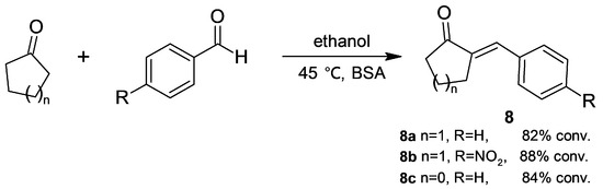 By testing nonvolatile cyclic ketones (Figure 5), the molar ratio of substrates was assayed in order to find the lowest suitable ketone concentration. Enone 8a was obtained in a high conversion and free from ketols at a low excess of cyclohexanone (benzaldehyde/cyclohexanone molar ratio = 2); cyclopentanone exhibited a similar behaviour. In contrast, when p-nitrobenzaldehyde was assayed, cyclohexanone gave high and selective conversion towards enone 8b, while cyclopentanone afforded a mixture of ketols and enone 8c with low selectivity. In addition, kinetic data of the BSA-catalyzed reaction of cyclohexanone and p-nitrobenzaldehyde suggests an ordered bi-bi mechanism for enone formation [33].