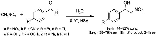 Albumin has been applied to catalyze the nitroaldol reaction (known as the Henry reaction), which affords synthetic useful β-nitroalcohols. Matsumoto and coworkers [34] assayed the reaction of nitromethane and p-nitrobenzaldehyde in water as a green solvent and tested albumins from different sources (bovine, chicken egg, goat, rabbit, porcine, and human). Even if high conversions to β-nitroalcohol 9a were reached, the reactions were not enantioselectivem except for HSA; denatured HSA did not afford an enantioselective reaction, indicating the role of protein conformational integrity in stereoselectivity. HSA catalysis was extended to a set of substituted benzaldehydes at low temperature (Figure 6), which improved stereoselectivity. Moderate enantioselectivities towards R-products 9a–g were reached; unexpectedly, the reaction of benzaldehyde proceeded with the opposite stereoselectivity (9h).