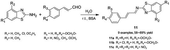 Imines, condensation products resulting from the addition of a primary amine to a carbonyl compound with subsequent elimination of water, are useful precursors for amines, and their synthesis is usually carried out at controlled acid pH. Looking for a mild procedure to obtain imines (11, Figure 9) from 2-aminobenzothiazoles and cinnamaldehydes, Sinha, Nazir, and coworkers [40] found that BSA in water at room temperature is a useful catalyst. Albumins from other sources (rabbit, pig, sheep, and chicken) were less effective; imines (Schiff bases) were obtained in a 58–89% yield using a mild and green protocol. These products were assayed in a C. elegans model of Alzheimer’s disease, and 11a–c showed potential as antiamyloid agents. This method was also extended to some anilines, providing the target Schiff bases in satisfactory yields.
