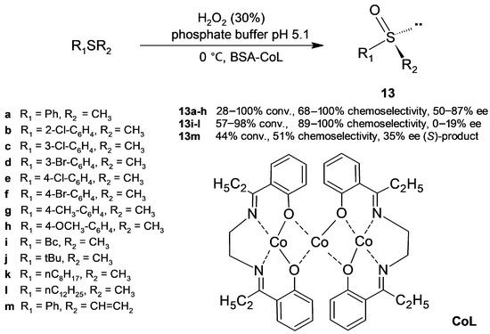 Artificial metalloenzymes result from the incorporation of a metal complex with catalytic activity into a macromolecular host, such as a protein, by covalent or coordination binding as well as by supramolecular anchoring [42]. In the latter case, the host protein should be resistant to denaturation, soluble in water, and commercially available at a reasonable cost; consequently, albumin is an attractive candidate to design artificial metalloenzymes. Broadening the application of metalloenzyme mimics based on albumin to oxidise sulfides into sulfoxides [22], Bian, Liang, and coworkers [43] introduced a cobalt (II)–Schiff base complex into BSA and assayed the resulting hybrid biocatalyst (BSA-CoL) in the reaction of sulfides with hydrogen peroxide (Figure 11). To optimize the reaction parameters (pH, concentration of substrate, oxidant and catalyst, and temperature), thioanisole was chosen as a model substrate; the most satisfactory conditions (Figure 11) led to 98% conversion into sulfoxide 13a (50% ee), which was free of sulfone (100% chemoselectivity). A blank reaction in the absence of the hybrid biocatalyst only produced a low conversion to a mixture of racemic sulfoxide and sulfone; in addition, non-hybrid BSA gave a very high conversion (85%) and 100% chemoselectivity towards sulfoxide but lower enantioselectivity (8% ee). Most of the sulfides were obtained in a good conversion and chemoselectivity through this mild procedure in aqueous medium involving a green oxidant (molar ratio of hydrogen peroxide/sulfide = 1.5). The oxidation of the aliphatic sulfides 13j–l was highly chemoselective but proceeded with low (13k) or null (13j,l) stereoselectivity, while oxidation of phenyl vinyl sulfide showed reverse enantioselectivity (13m).