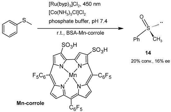 On the other hand, Gross, Banse, Mahy, and coworkers [45] designed a metalloenzyme by incorporating a Mn (III)-sulfonated corrole (Figure 12) into BSA and assayed the hybrid in vis-light-induced oxidation of thioanisole at pH 7.4, with a ruthenium (II)–trisbipyridyl complex as a photosensitizer and a cobalt (III) complex as an electron acceptor. Even if the conversion and enantioselectivity were modest, this is a mild and green procedure for oxidation that avoids the use of an external oxidizing agent, since it involves oxygen transfer from water by the corrole attached to BSA.