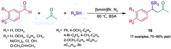 On the other hand, the same research group developed a strategy to obtain β-aryl-β-sulfidocarbonyl compounds (18, Figure 16) in good high yields based on a BSA-catalyzed three-component reaction in ionic liquid (IL) [52]. The mild and base-free procedure involves tandem aldol condensation–thia-Michael addition; in the former reaction, a benzaldehyde and acetone react to give an enone, whose reaction with a thiol affords the target products. In contrast with the synthesis of sulfenylated indoles discussed above, the biotransformations were conducted under a nitrogen atmosphere to avoid transformation of nucleophilic thiol into disulfide. The most satisfactory reaction conditions were found after screening for temperature, thiophenol amount, biocatalyst (albumin loading and source), and IL. By testing either BSA in the absence of 1-butyl-3-methylimidazolium bromide ([bmim]Br) or IL in the absence of BSA, the initial aldol condensation was not even observed, a fact suggesting a synergistic interaction between BSA and IL. To gain insight into the synergism, the procedure was studied by NMR and DFT, and a mechanism for the tandem reactions was proposed, based on a lysine residue of BSA. In addition, the catalytic system showed good recyclability up to five runs.