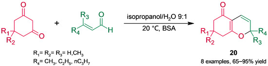 Zhou and coworkers [63] used BSA catalysis to obtain a skeleton derived from 2H-chromen-5(6H)-one (Figure 18) through a tandem process involving 1,2-addition of the dione to the α,β-unsaturated aldehyde, intramolecular addition, and water elimination. Among the assayed reaction parameters (solvent, molar ratio of the substrates, water content, BSA loading, and temperature), temperature had no significant impact on conversion. In isopropanol–water at 9:1 and at 20 °C, a set of 7,8-dihydro-2H-chromen-5(6H)-ones (20) were produced in moderate–high yields.