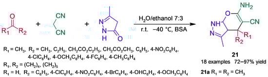 Pyrano[2,3-c]pyrazole scaffold exhibits diverse biological activity; consequently, interest in the green synthesis of this core and its derivatives has increased over the last decade [64]. Chaudhari and coworkers [65] studied the biocatalyzed three-component reaction of acetone, malononitrile, and 3-methyl-1H-pyrazol-5-(4H)-one (Figure 19), which occurred through tandem Knoevenagel condensation–Michael addition followed by cyclization and tautomerization. Substrates were assayed in an equimolar ratio, and since BSA surpassed the assayed promiscuous enzymes (lipases, proteases, and α-amylase), it was chosen for further optimization of reaction parameters (solvent, BSA loading, and temperature); among them, solvent and water content had a drastic effect on the product yield. Under the most satisfactory conditions (Figure 19), the corresponding dihydropyrano[2,3-c]pyrazole 21a was obtained in a 94% yield, and the procedure was extended to a set of ketones and aldehydes, obtaining good-to-high product yields. An assay of isatines as carbonyl compounds resulted in obtaining spiro[indoline-3,4′-pyrano[2,3-c]pyrazole]derivatives in excellent yields. In addition, the procedure was carried out at the gram scale and by testing BSA recyclability, and only a slight decrease in product yield was observed after four reaction cycles. A mechanism for the MCR synthesis was proposed based on a lysine residue of BSA.