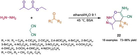 In another BSA-catalyzed approach to dihydropyrano[2,3-c]pyrazoles 22 (Figure 20), Li and coworkers [66] built both heterocyclic moieties of the target products by exploring a four-component reaction between hydrazine hydrate, malononitrile, ethyl acetoacetate, and several carbonyl compounds, tested at an equimolecular ratio (Figure 20). Compared to the tandem process presented above, this MCR adds a step to form 3-methyl-1H-pyrazol-5-(4H)-one by condensation of ethyl acetoacetate and hydrazine, which subsequently react by the tandem reactions mentioned above; a mechanism based on a lysine residue of BSA was proposed. BSA again outperformed the other assayed biocatalysts and showed only a slight loss of activity after five reaction cycles; on the other hand, by screening reaction parameters, the survey of reaction solvents was crucial to reach high product yields.