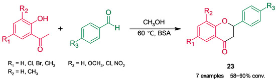 Flavanones (2-phenylchroman-4-ones), a group of flavonoids with more than 300 structures identified in nature, possess highly diverse biological activity [67]. Their conventional synthesis is based on Claisen–Schmidt condensation of a 2′-hydroxyacetophenone and an aldehyde to give a chalcone, whose subsequent cyclization through an intramolecular oxa-Michael addition affords the target flavanones (23, Figure 21). Since the hot and strong basic medium involved in the synthesis promotes side reactions, in our laboratory, we extended our results of BSA-catalyzed Claisen–Schmidt condensation (Section 2.1.1) and tested albumin in a tandem Claisen–Schmidt condensation–oxa-Michael addition. After a screening of reaction parameters (solvent, substrate molar ratio, and temperature), flavanones were obtained in a 58–90% conversion [68].