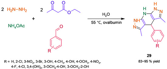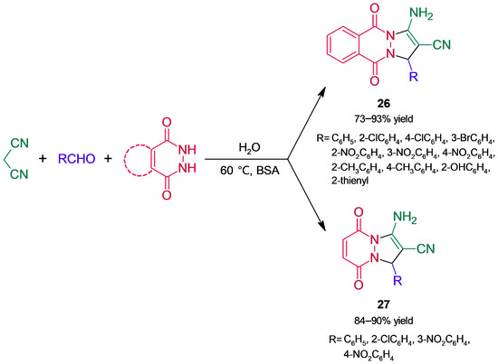 In another application of albumin to build pyrazole core derivatives, a set of derivatives of the pyrazolophthalazine ring (1H-pyrazolo[1,2-b]phthalazine-5,10-diones, 26, Figure 24) were obtained in good high yields through a BSA-catalyzed three-component reaction in water [69]. One of the substrates was a hydrazide, and the MCR involved tandem Knoevenagel condensation–Michael addition followed by cyclization and tautomerization. BSA outperformed the assayed promiscuous enzymes, and most of the tested organic solvents resulted in poor conversions, while temperature and albumin loading had less influence on the biotransformation. Replacement of phthalic hydrazide by maleic hydrazide resulted in obtaining pyrazolopyridazine derivatives (1H-pyrazolo[1,2-a]pyridazine-5,8-diones, 27) in high yields.