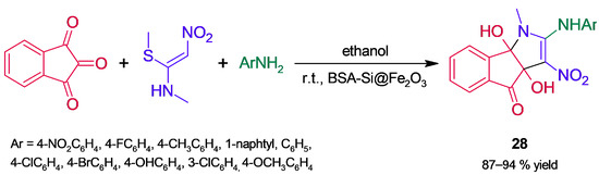 Tandem and multicomponent reactions (MCRs) are useful processes since tandem reactions replace multi-pot stepwise processes by one-pot reactions, while MCRs combine three or more compounds to afford the target product. Therefore, they avoid intermediate workup steps and usually involve atom efficiency. The following examples covering the last decade illustrate the potential of albumin in these processes.