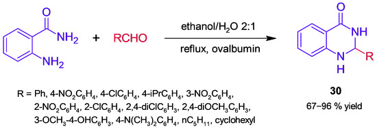 - Mirjalili, B.B.F.; Eliin, S.D.; Fazeli-Attar, S.A. Synthesis of 2,3-Dihydroquinazolinones Using Nano-Ovalbumin as a Non-Toxic Biocatalyst. SN Appl. Sci. 2020, 2, 830. [Google Scholar] [CrossRef]