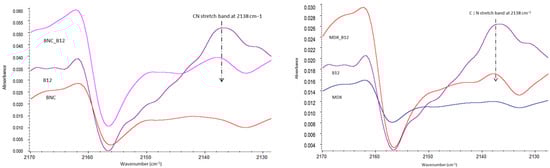 As visible from Figure 2, the main structure of B12 is maintained when loading it onto the BNC or MDX. Characteristic bands of B12 are present in the spectra of BNC_B12 and MDX_B12. For example, the cyano group from B12 (cianocobalamin) showed no degradation of the vitamin [5]. However, a shift in the cyano band at 2138 cm−1 was observed, which provides evidence of the interaction of B12 with both materials, BNC and MDX.