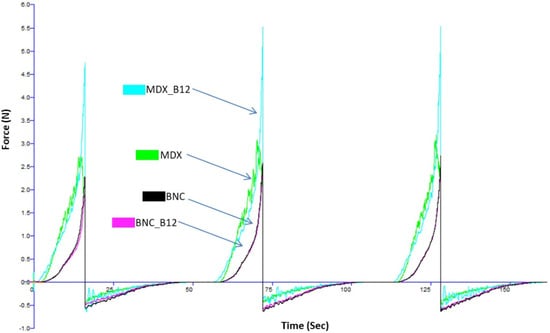 Additions of vitamin B12 to BNC did not increase the peak force in comparison to pure BNC powder. Conversely, it is observed that the addition of vitamin B12 to MDX increases the peak force compared with pure MDX. BNC and MDX, being hydrocolloids, readily absorb moisture. When B12 is added to the polymer system, the vitamin competes with the water molecules for the active sites of the polymer [29]. This is in accordance with the interactions observed by FTIR, showing that vitamins are absorbed by physisorption by hydrogen bonds. It observed that even when both BNC and MDX have same moisture, there is a difference between force peaks which is an indicator that free water is more abundant in MDX than BNC due to specific chemical structure of each polymer [23]. Water uptake is generally inversely proportional to molecular weight [6]. Because BNC contains a significant proportion of high-molecular-weight components, it reached moisture equilibrium faster compared to MDX, which is characterized by lower molecular weights, leading to a greater amount of unbound water [23]. Hence, MDX powders can undergo hydration that finally leads to higher peak forces, especially when mixed in MDX_B12. The high-molecular-weight fibrils of BNC rapidly achieved equilibrium, while the lower molecular weight of MDX led to higher proportions of unbound water.