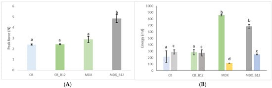 Flow characteristics of BNC, MDX, BNC_B12, and MDX_B12 powders were evaluated using a TA.XTplus Texture Analyzer (Stable Micro Systems, Godalming, UK) equipped with a Powder Flow Analyser accessory and a 23.5 mm diameter blade probe. This instrument employs rotating blades that move vertically to assess powder behavior. Prior to testing, a consistent volume (140 mL) of each powder was placed into the testing container. The samples underwent three conditioning cycles, involving vertical movement (down and up) of the blades at a speed of 50 mm/s. Compaction behavior was assessed as the rotating blade moved downward, while cohesive properties were measured during the upward blade movement, both at a speed of 50 mm/s. Three compression and cohesion measurements were performed consecutively within each test run, and this entire procedure was repeated three times for each material. The peak force recorded during the downward blade movement represented the maximum force required for compression. Energy expenditure for compression and decompression was calculated based on the positive and negative areas under the force–time curves, respectively, obtained by multiplying the area under the curve by the blade tip speed [8].