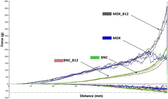 Force–distance profiles from powder analysis (MDX B12: Dark Gray, MDX: Ink Blue, BCN: Green, BNC_B12: Red).