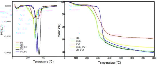 The TGA thermal profiles were compared to the corresponding BNC, MDX, B12, BNC-B12 and MDX-B12 (Figure 8). All the samples showed a weight loss between room temperature and 150 °C, corresponding to the loss of powder moisture. A second significant weight loss stage in both TG and DTG curves of each sample is observed between 170 °C and 400 °C. Weight loss for BNC and BNC-B12 begins at 260 °C and ends at 400 °C, which is consistent with Jiang [40]. Weight loss for MDX and MDX_B12 begins at 174 °C and ends at 350 °C which is consistent with Paini [41]. In the pure vitamin B12 the degradation begins at 200 °C, while MDX degradation begins at 174 °C. In the mix of MDX_B12 the degradation also begins at 174 °C, which means that there is no improvement in the thermal behavior of B12. In BNC_B12 it is possible to note how the degradation index follows the degradation index of BNC indicating that both degradations B12 and BNC occur at the same time. Thermal behavior of B12 is improved by BNC, changing the start of degradation temperature of B12 from 200 °C to 260 °C and the maximum temperature degradation from 270 °C to 317 °C.
