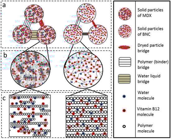 For MDX solid bridges or “necks” are visible that impair the mechanical strength of the dry granule [20] (Figure 7). It is important to note that this interpretation is a proposed model based on the visual evidence from the micrographs. The structures identified as “bridges” could potentially be distorted particles or artifacts from the sample preparation and drying process. Further analysis would be required to verify the exact nature of these connections and to determine if any vitamin B12 is present within them. The largest solid bridges are present in pure MDX powder but for MDX_B12, the solid bridges of the particles are linked with each other through smaller solid bridges. The MDX solid bridges are large in volume and allow the formation of more voluminous bridges than those of MDX_B12. Solid bridges are less visible in BNC powders.