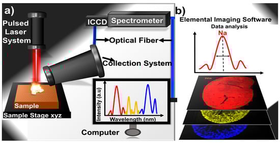 The spectrometer records these emissions to get the spectrum. These spectra were further analysed to determine the elemental composition of the target [47], and the images formed are shown in Figure 2b. LIBS fundamental principle can be summarised in four steps: (i) laser ablation process, (ii) plasma formation and plasma plume expansion, (iii) plasma emission, and (iv) spectral analysis [54,55,56].