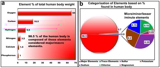 (a) Most abundant element in the human body; (b) categorisation of elements into major, minor, and trace elements based on percentage in the human body (data collection [94]).