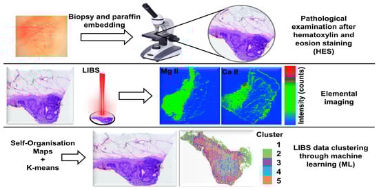 Kiss et al. (2021) [51] conducted a spectral study, and the analysis of four biogenic elements (Mg, Ca, Na, and K) showed higher concentrations of Mg, Na, and K in tumour-affected tissues. The progression of the tumour was examined by capturing biotic elemental (Mg, Na, and K) imaging. It was correlated with the concentration and spatial distribution of elements within malignant tissues, as illustrated in Figure 4. The distribution and proliferation of calcium are not well understood outside the tumour region. The authors declared the novelty of their work in hyperspectral data processing and k-clustering analysis for discriminating cutaneous tissue from its healthy surroundings. In research work, LIBS-3D imaging involves a complex sample preparation procedure, such as FFPE, which contrasts with the fact that LIBS typically require minimal or no sample preparation. An experimental method is lengthy, as it involves background correction for every single laser shot. The destructive effect on tissue, spatial resolution, and self-organising map (SOM) data interpretation information is not reported for in-depth understanding. Choi et al. (2021) [82] performed ultraviolet (UV-fs-LIBS) imaging of melanoma-affected skin tissue to classify melanoma and dermis. During the experiment, femtosecond laser operated at the UV region (343 nm) with a laser energy of 50 µJ provided a consistent crater pattern with minimal debris on the periphery of the exposed tissues. Spectral analysis revealed the intensity ratio and peak intensity of the element as a classifier to identify melanoma regions. LIBS imaging was performed, and results were validated with hematoxylin and eosin (H&E) staining images, confirming the identification of cancer with LIBS. They suggested that a UV-fs-laser is more appropriate for imaging, and achieved a spatial resolution of 15 µm.