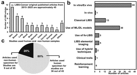 Distribution of journal-published articles on LIBS in cancer research for the period 2015–2025 (45 original articles). Statistical information about (a) number of articles related to different types of cancer; (b) adoption of methodologies and clinical trials; (c) number of studies performed on human and non-human specimens. Types of cancer and related references: skin [51,52,82,117,118,125,145,150,168,171,174], breast [35,47,127,162,163,169,175], lung [121,157,158,159,160,164], blood [48,119,166], brain [131,151,165], stomach [123,156], colon [50,81,120], cervical [31,161], ovarian [27,172], prostate [122], and others [39,83,132,153,199].