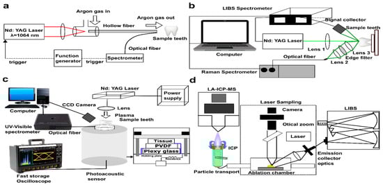 - Hamzaoui, S.; Nouir, R.; Jaidene, N. The study of carious teeth by laser-induced breakdown spectroscopy. J. Appl. Spectrosc. 2017, 84, 82–86. [Google Scholar] [CrossRef]
