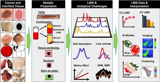 LIBS enable rapid elemental ana lysis of cancerous and calcified tissues, serving as a powerful tool for pathological diagnosis and physiological monitoring [35,36,37]. Classification of pathologies corresponds to variations in laser-induced plasma characteristics, elemental concentrations, detection of toxic metals, molecular decomposition, de/remineralisation, chemical imbalances, calcification, and carbonisation [34,38]. LIBS achieved significant milestones in cancer diagnostics and the investigation of calcified tissue, as highlighted in Figure 1. However, its clinical adoption remains limited due to challenges, for instance the matrix effect, issues in signal reproducibility, sensitivity issues from tissue heterogeneity, and ablation-induced sample destruction [39,40,41]. The path forward lies in intelligent calibration systems and hybrid analytical approaches that compensate for these technical challenges by providing linearity, sensitivity, and robustness to signals [42]. In 2019, Gaudiuso et al. [43] devoted review sections to LIBS-based analysis of calcified tissues and the application of LIBS for cancer diagnosis using fluid specimens of humans and animals. In 2022, Khan M.N. et al. [40] reviewed advancements in LIBS for diagnosing various cancers using different tissue samples and body fluids and Khan Z. et al. [44] reviewed trace element detection in biomaterials and other materials. The importance of LIBS in calcified tissue analysis was highlighted by Singh et al. [16] a decade ago.