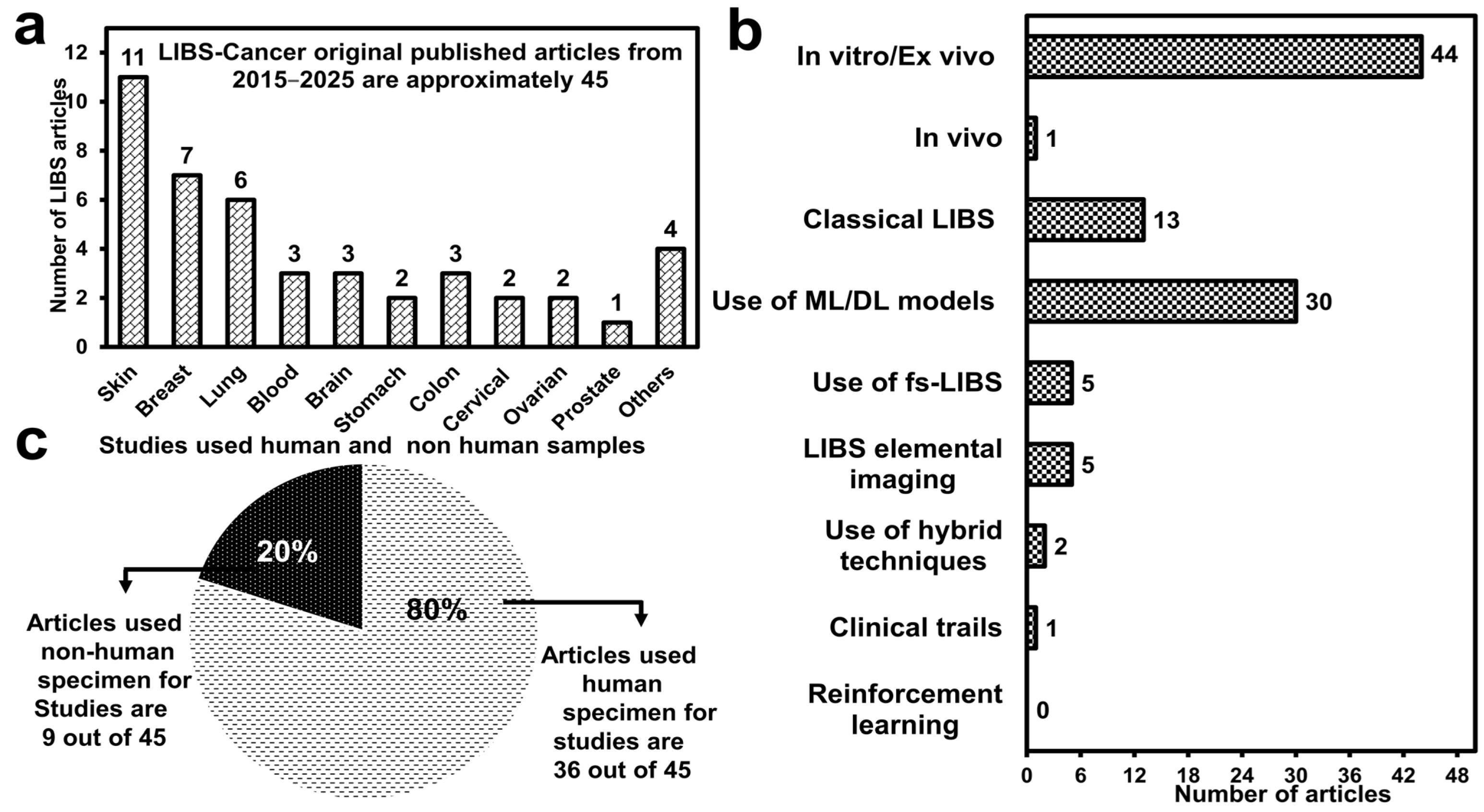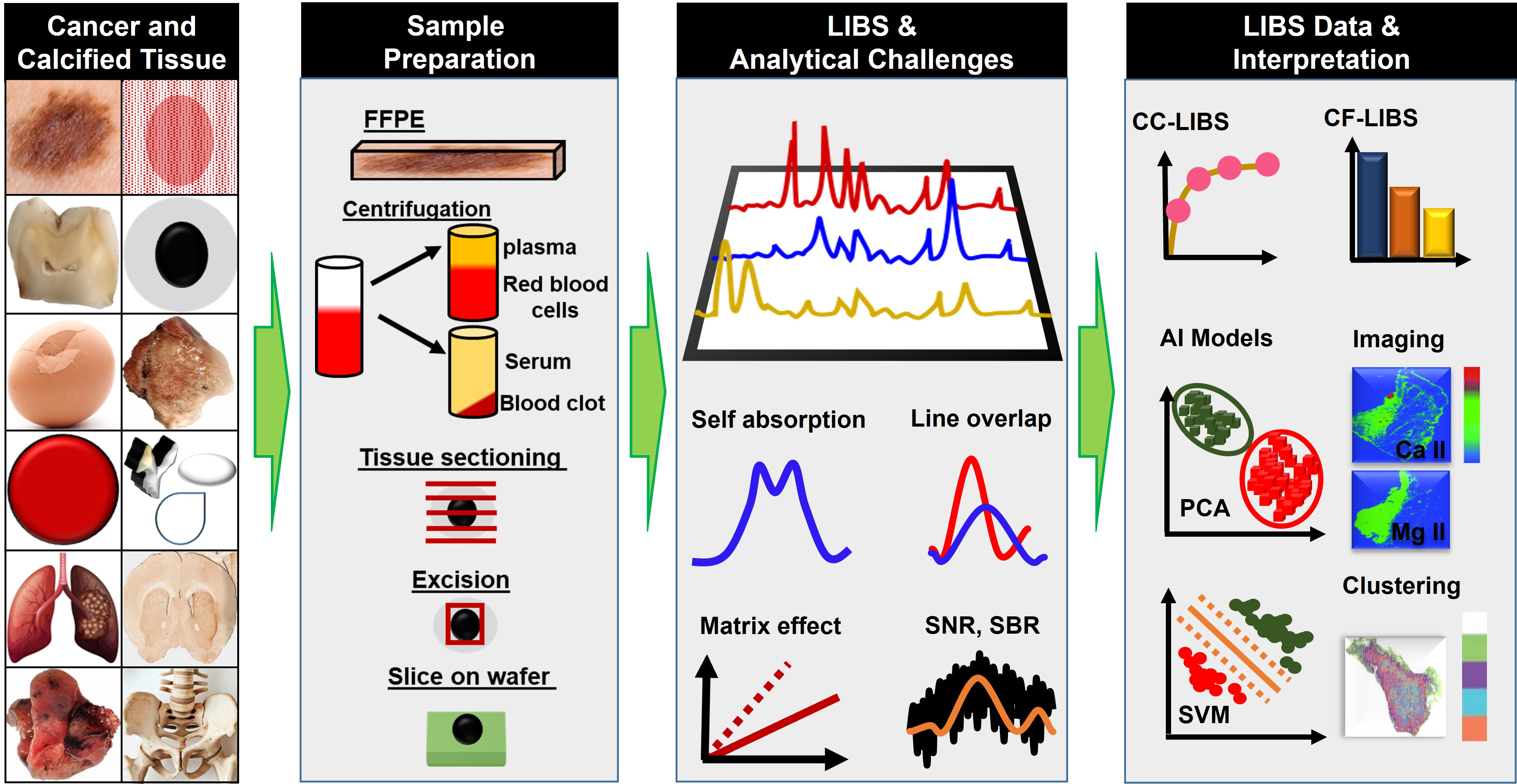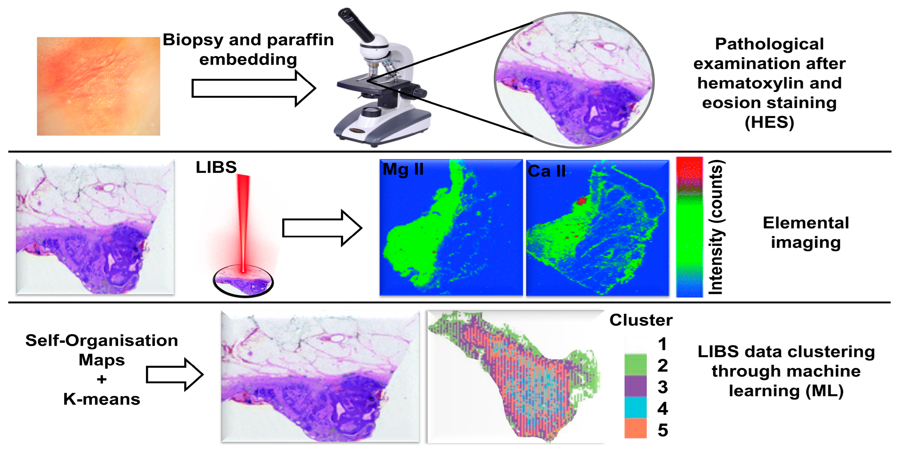 The first research on cancer via LIBS was performed in 2004, focusing on discriminating cancerous tissues from healthy ones (in dogs) [167]. This foundational research work laid the groundwork for subsequent studies examining LIBS in multiple cancer diagnostics. LIBS cancer screening and pathology identification efficacy provides simpler and more realistic objectives as a complementary approach to traditional histopathological examination [117].