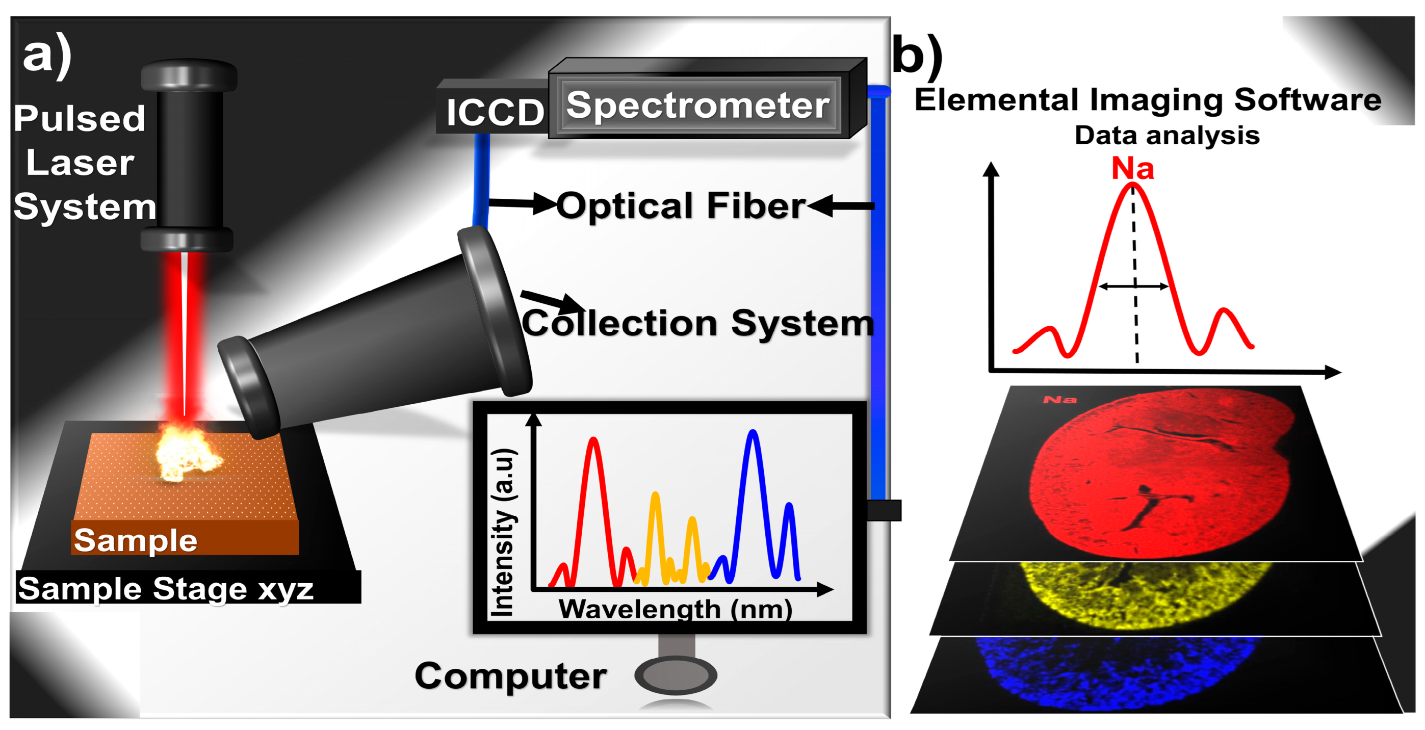 LIBS has garnered considerable attention from researchers in biomedical fields over recent years, yielding prolific outcomes either alone or in combination with other supporting techniques [1,2,3]. This laser-induced plasma spectroscopy method stands out for its speed, non-destructiveness, real-time analysis, minimal or no sample preparation requirement, multi-element detection, and relatively inexpensive instrumentation [4]. It has been effectively used for environmental monitoring [5,6], agricultural materials inspection [7], archaeological investigation [2,8], geological mining [9,10], industrial applications [4,11], space exploration [12], forensic sciences [13], health sciences [14,15], and biological detections [16,17].