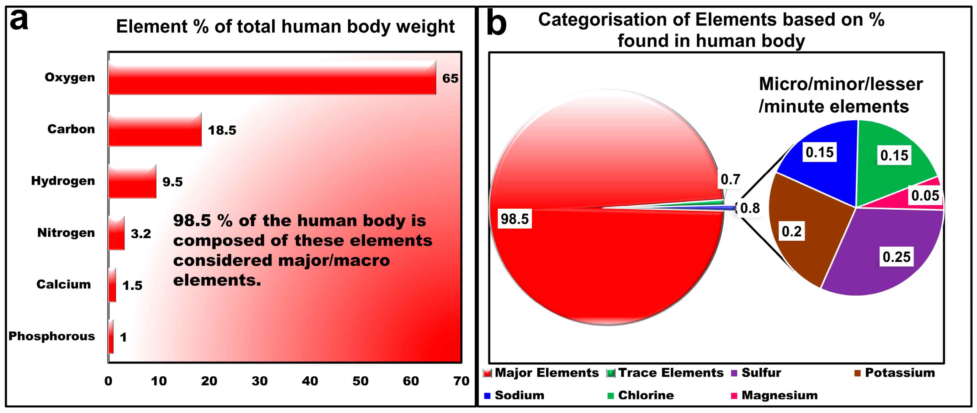 Major/macro, micro/minor/lesser/minute, and trace elements constitute 98.5%, 0.7%, and 0.8% of total human body weight, respectively, as illustrated below in Figure 3 [94]. Macroelements are crucial for regulating glucose metabolism and detoxifying contaminants, whereas micronutrients are essential for the body in minute quantities for the proper growth and development of organs. Trace elements, though scant, are pivotal: their imbalance triggers the disease, from hyperglycemia to toxic metal poisoning, serving as silent biomarkers for cancer and calcified tissue disorders [68,91,92]. Yet quantifying them remains a challenge that one LIBS could overcome [92] if its limitations, particularly matrix effects, are addressed.