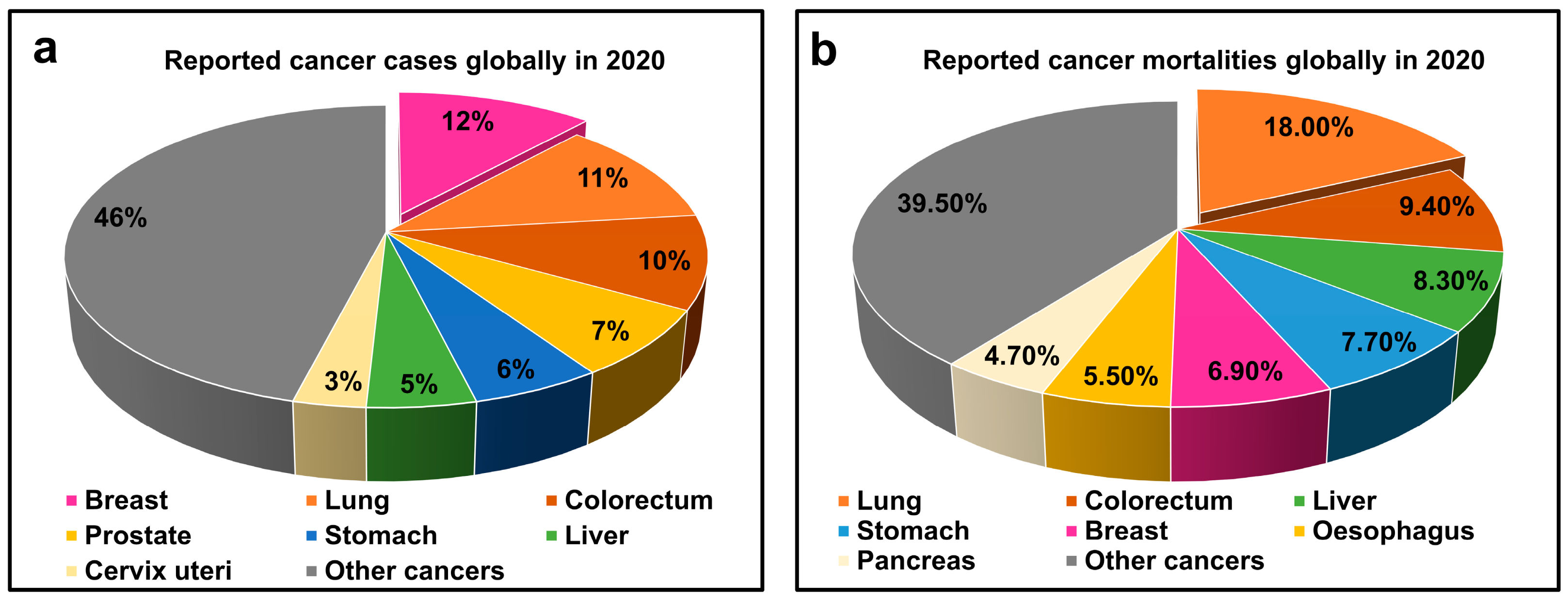 Lung cancer has been a serious public health concern due to its high incidence and mortality rate. Globally, the lung cancer death rate in 2020 was the highest among all types of cancers, as shown in Figure 5. Approximately 1.8 million people are diagnosed with this disease, and 1.6 million die annually; these statistics are relatively higher than other oncology-related threats [20,198]. Lin et al. [159] differentiated between lung tumour tissue and boundary tissue by using LIBS-ML models. After pre-processing the LIBS spectral data of 90 tissues from 45 patients, principal component analysis (PCA) is used for dimensionality reduction, and random forest (RF) is used for feature selection. Limitations of PCA and RF (variance may not be informative, biasing towards high cardinality features, and inability to provide causal interpretation) may cause the loss of important information required for diagnosis. PCA-SVM and RF-BT models are trained and tested with compromised features. RF-BT diagnostic performance is declared to be superior to that of other models. However, the difference among model index indicators is less than 6% for all models. Li et al. (2024) [158] developed a bagging voting fusion (BVF) algorithm and proposed it as a method to overcome the limitations of single models in identifying complex cancers. In BVF, five models (SVM, ANN, KNN, QDA, and RF) were fused at both training and decision levels to process LIBS data to increase the diagnostic accuracy of multiple types of cancers (liver, lungs, and esophageal). The model claimed to achieve an accuracy of ~92% and a recall of ~93% for all serum samples, outperforming the best single model (SVM: accuracy of ~76%, recall of ~78%). To conclude, LIBS-BVF enables rapid (<3-min) and precise detection of a multitude of cancers, representing a transformative approach to clinical cancer diagnostics. In the above studies, dimension reduction approaches (PCA, FS, FE) are used to enhance model performance by sacrificing some of the information that must be given as input to build them. The high accuracy of LIBS-ML algorithms does not guarantee a reliable cancer diagnosis, as some ML models lack causal explanation mechanisms, which complicates the evaluation of their scientific validity and undermines the trust of oncologists [181].
