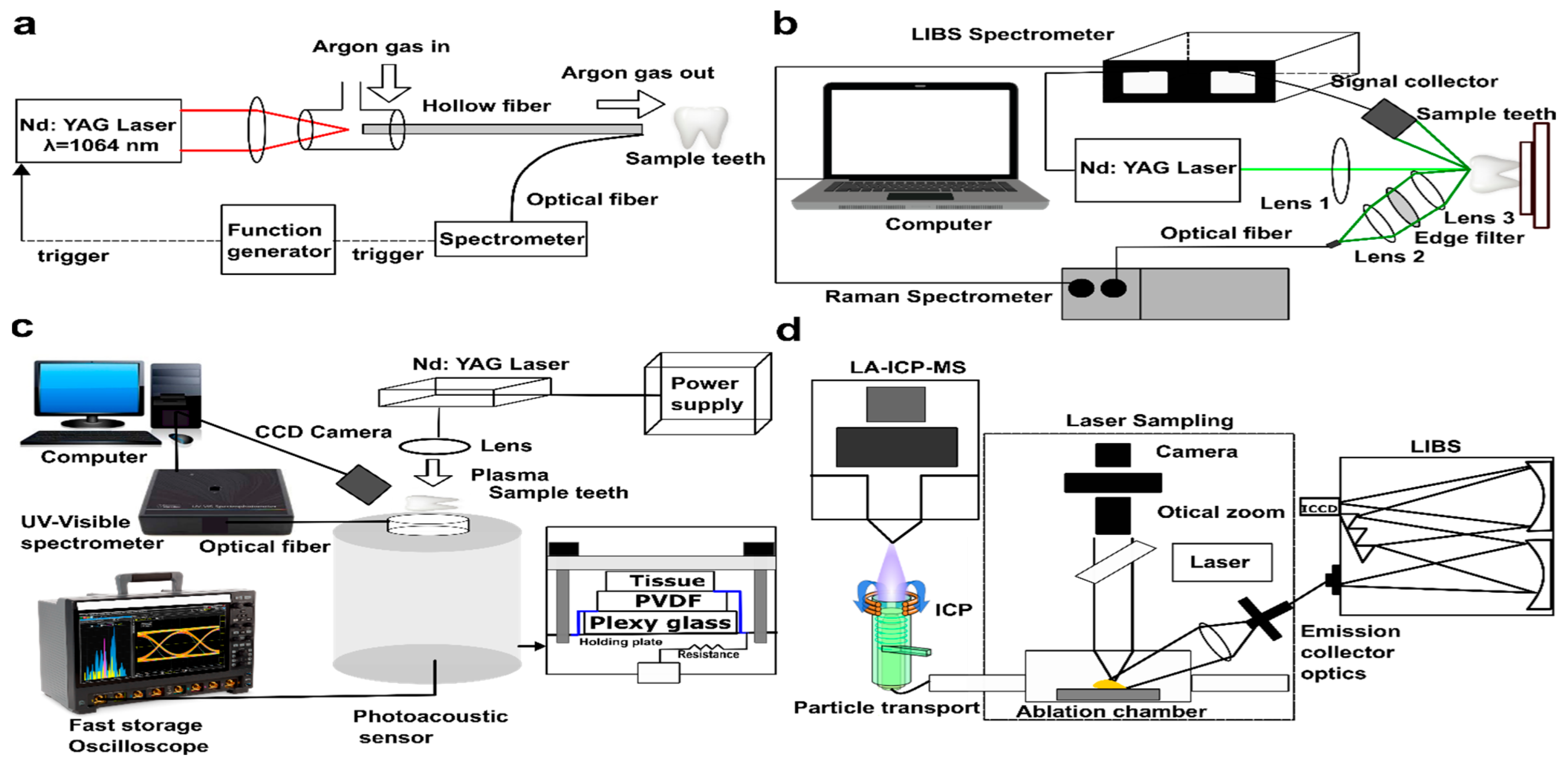 Fs LIBS enables one to map the distribution of tooth elements with spatial resolution of 100 µm [80]. Fs-DP-LIBS signals are enhanced up to 5-fold compared to fs-SP-LIBS when exploited to bovine tissues (liver and muscle). However, the enhancement factor is depending on several factors including physicochemical matrix effects, sample preparation, environmental conditions, and instrument specifications [133]. Fs-pulses enable the removal of caries from dental tissues through a precise ablation process, but optimisation of the fs-LIBS experimental setup is the prerequisite for controlling temperature [84].