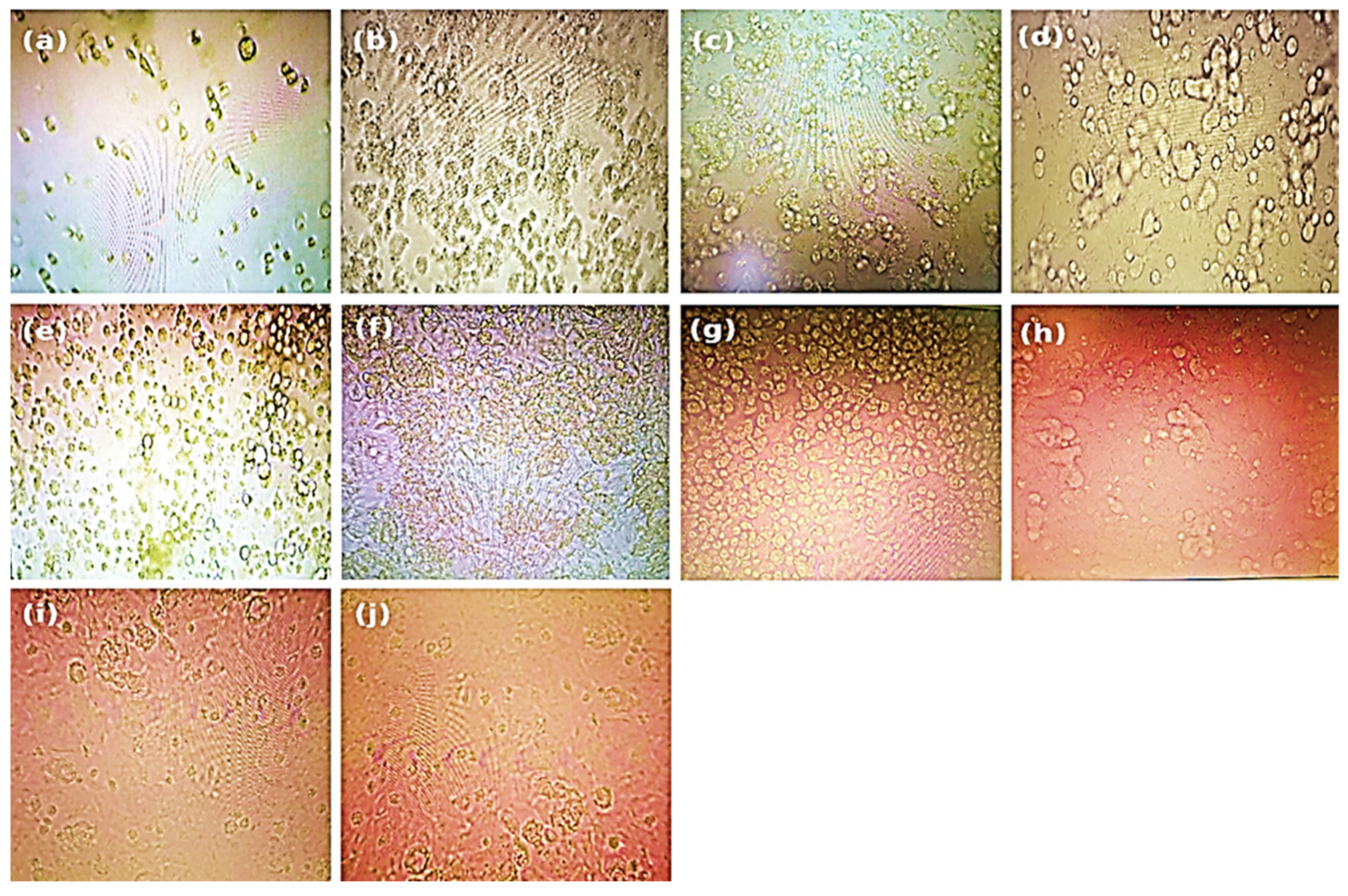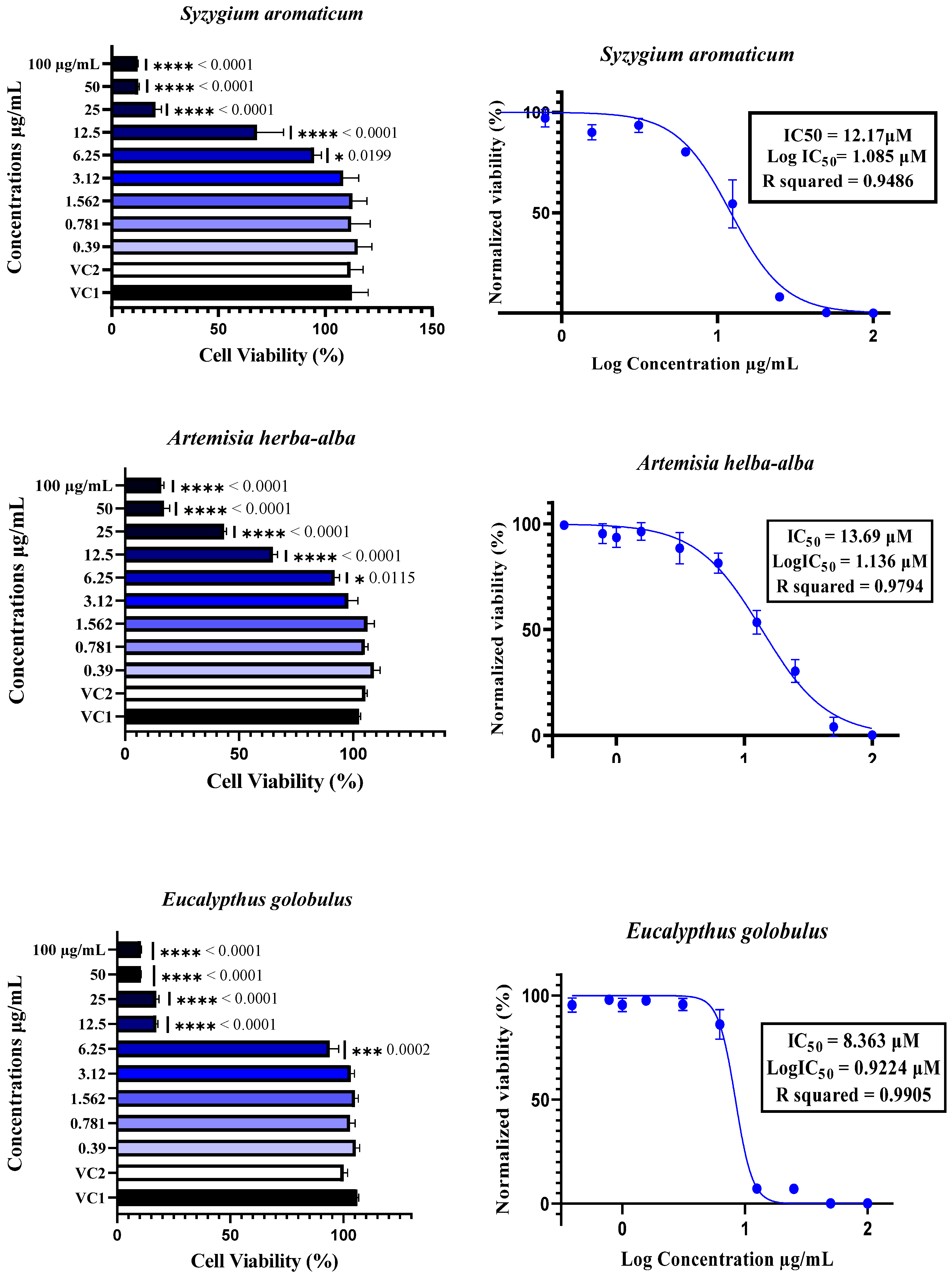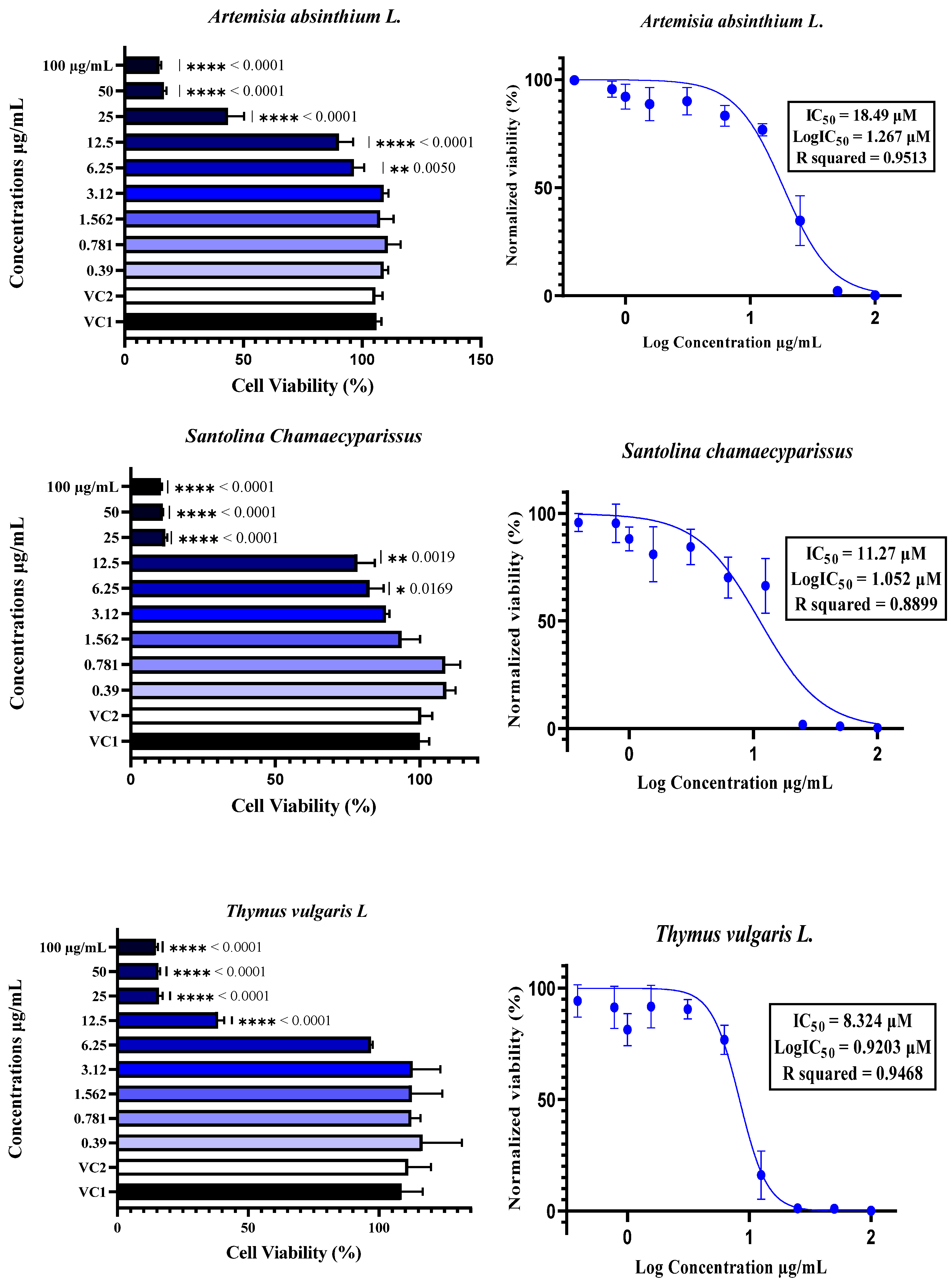 Figure 3). The results revealed a clear dose-dependent cytotoxic effect, with essential oils exhibiting significantly reduced cell viability at concentrations ≥12.5 µg/mL, as confirmed by one-way ANOVA (