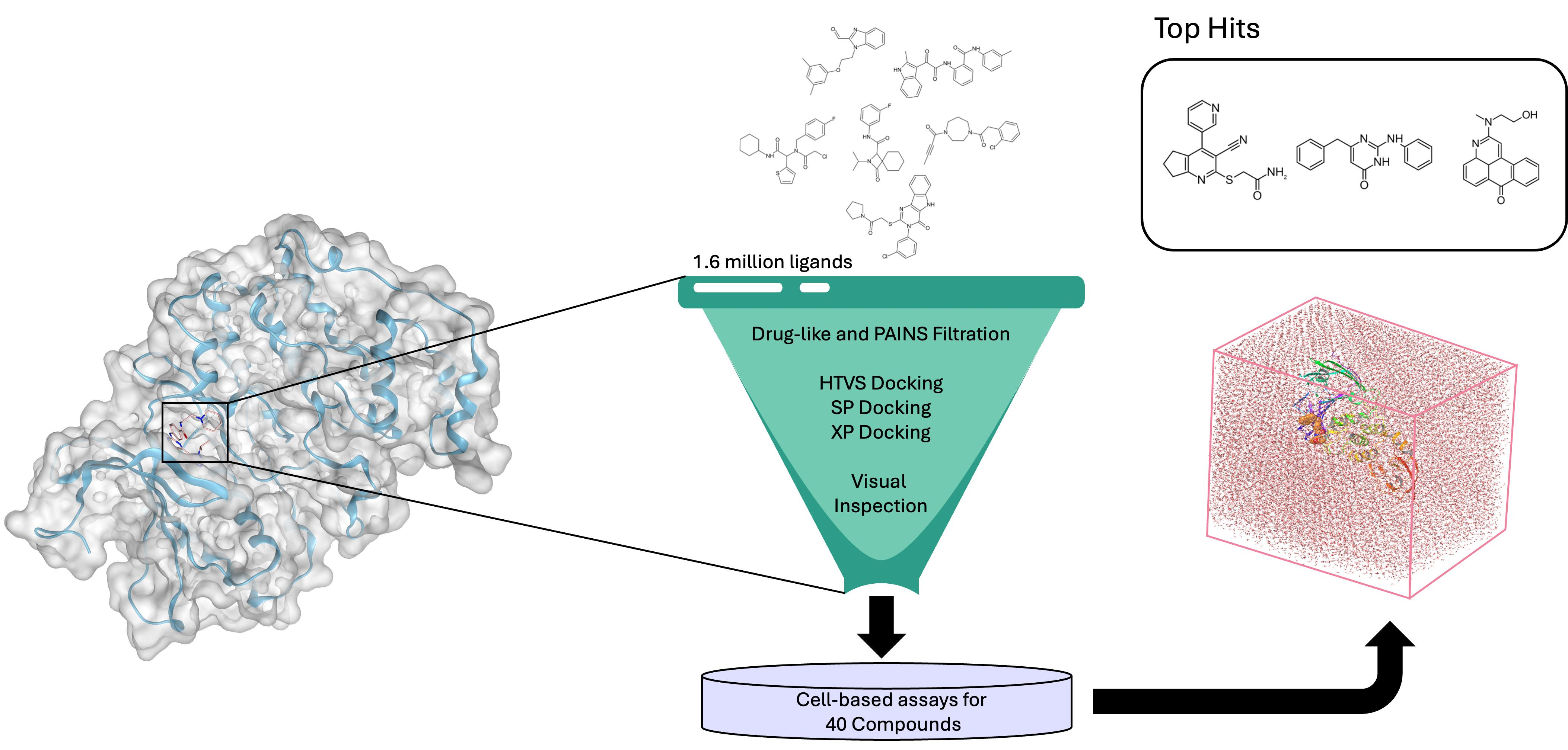 The virtual screening protocol used to filter the extensive compound database, comprising ~1.6 million ligands from TimTec and ChemDiv combined, is depicted in