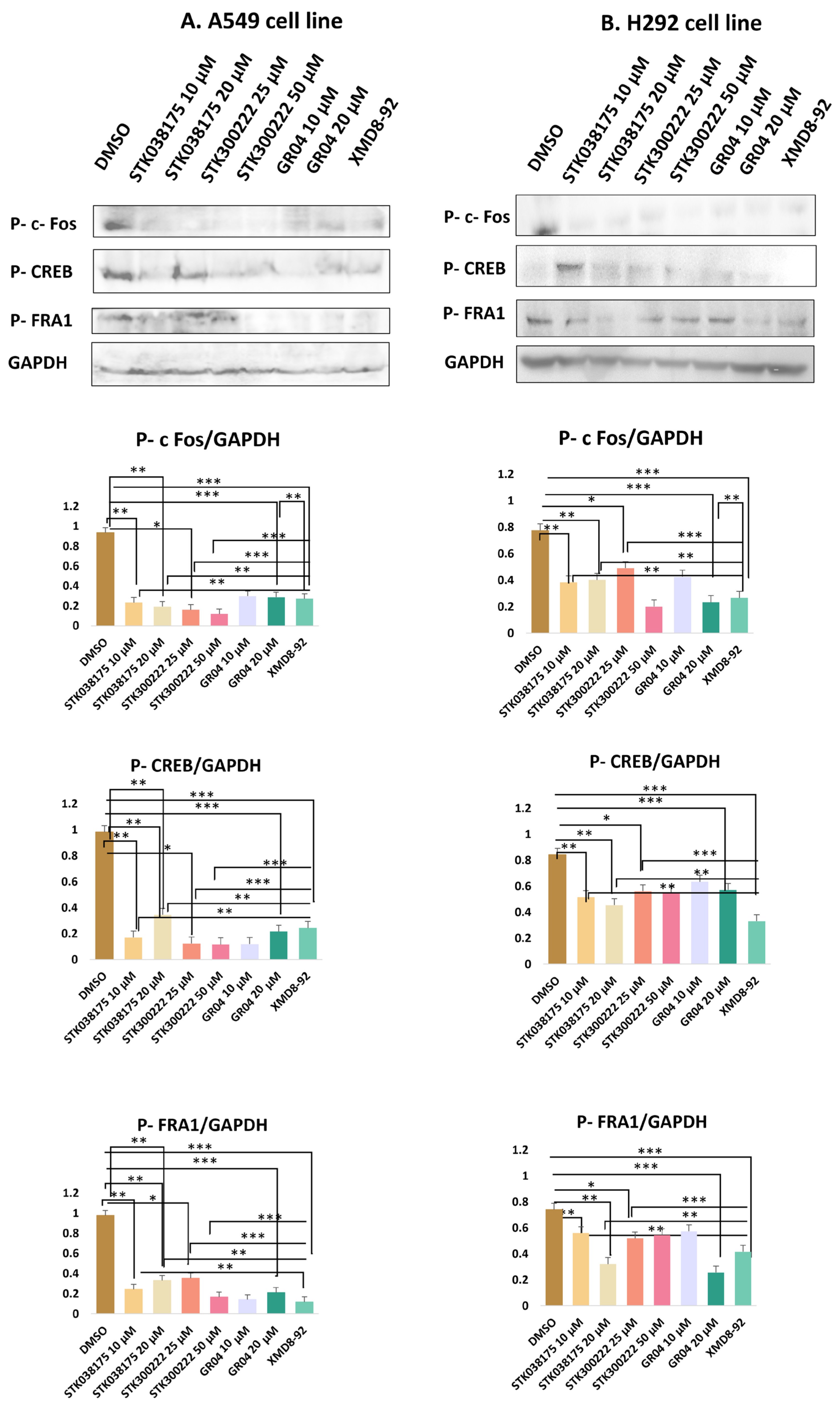 In H292 cells, the inhibitors showed reduced efficacy compared to A549 cells. STK038175 caused mild reductions in the phosphorylation of Phospho-c-Fos, Phospho-CREB, and Phospho-Fra1 at both 10 µM and 20 µM, with statistical significance only at 20 µM for Phospho-c-Fos and Phospho-CREB (p < 0.05 vs. DMSO control). However, the inhibitory effects of STK038175 were significantly weaker than XMD8-92 across all targets (p < 0.01 for STK038175 vs. XMD8-92). STK300222 exhibited moderate inhibition of the three phospho-proteins at 25 µM (p < 0.05), but no further reduction was observed at 50 µM, resulting in significantly lower efficacy compared to XMD8-92 at both doses (p < 0.001 for STK300222 vs. XMD8-92). GR04 demonstrated strong suppression of Phospho-c-Fos, Phospho-CREB, and Phospho-Fra1 at 10 µM and near-complete inhibition at 20 µM (p < 0.001 for 20 µM vs. DMSO control). The effects of GR04 at 20 µM were comparable to XMD8-92 for Phospho-CREB and Phospho-Fra1 (p > 0.05 vs. XMD8-92) but remained slightly less effective for Phospho-c-Fos (p < 0.01 vs. XMD8-92).