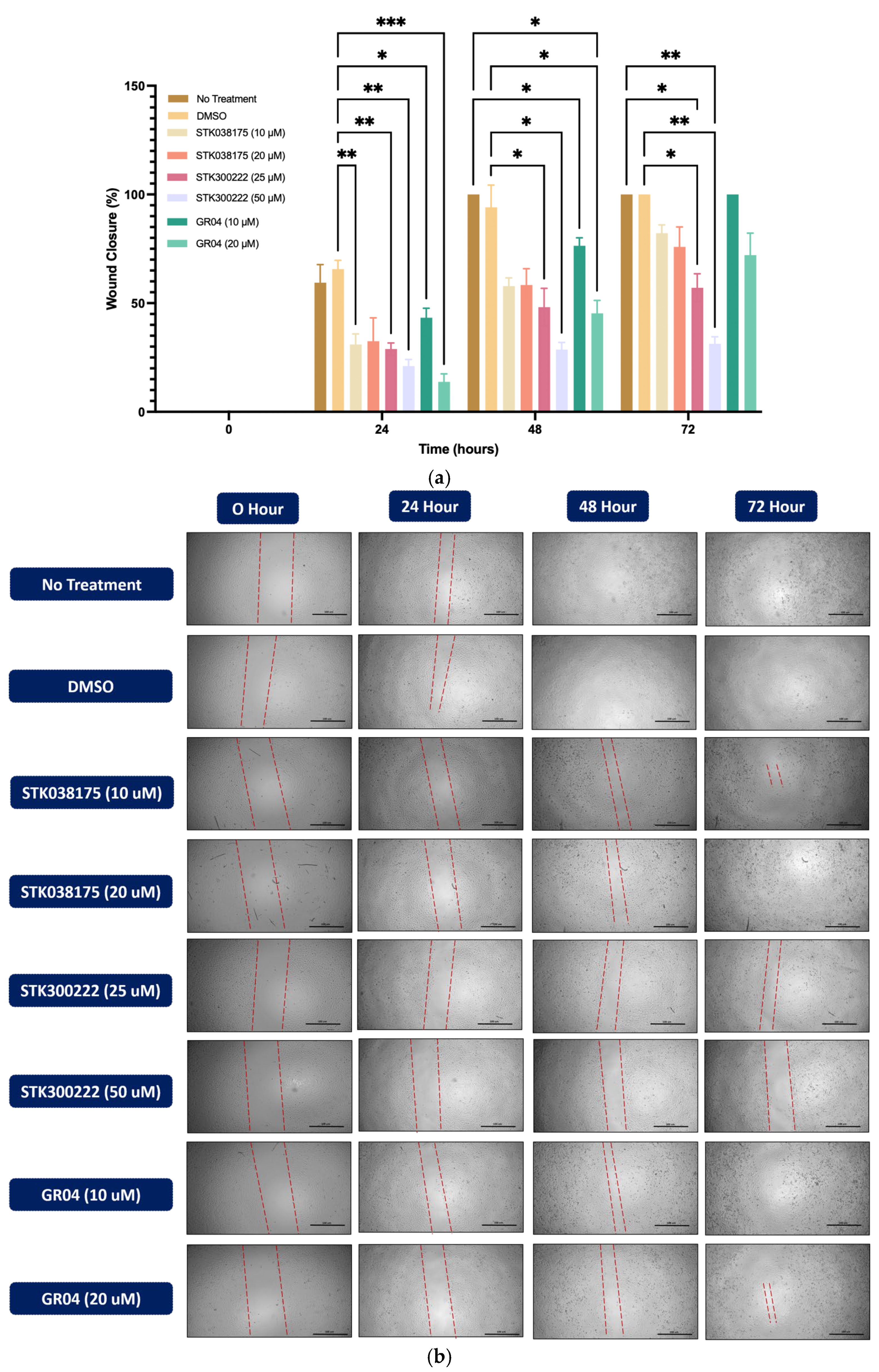 p < 0.001 vs. DMSO). GR04 at 20 µM also effectively prevented wound closure, maintaining levels below 25% at 72 h, though STK300222 at 50 µM demonstrated slightly superior inhibition (