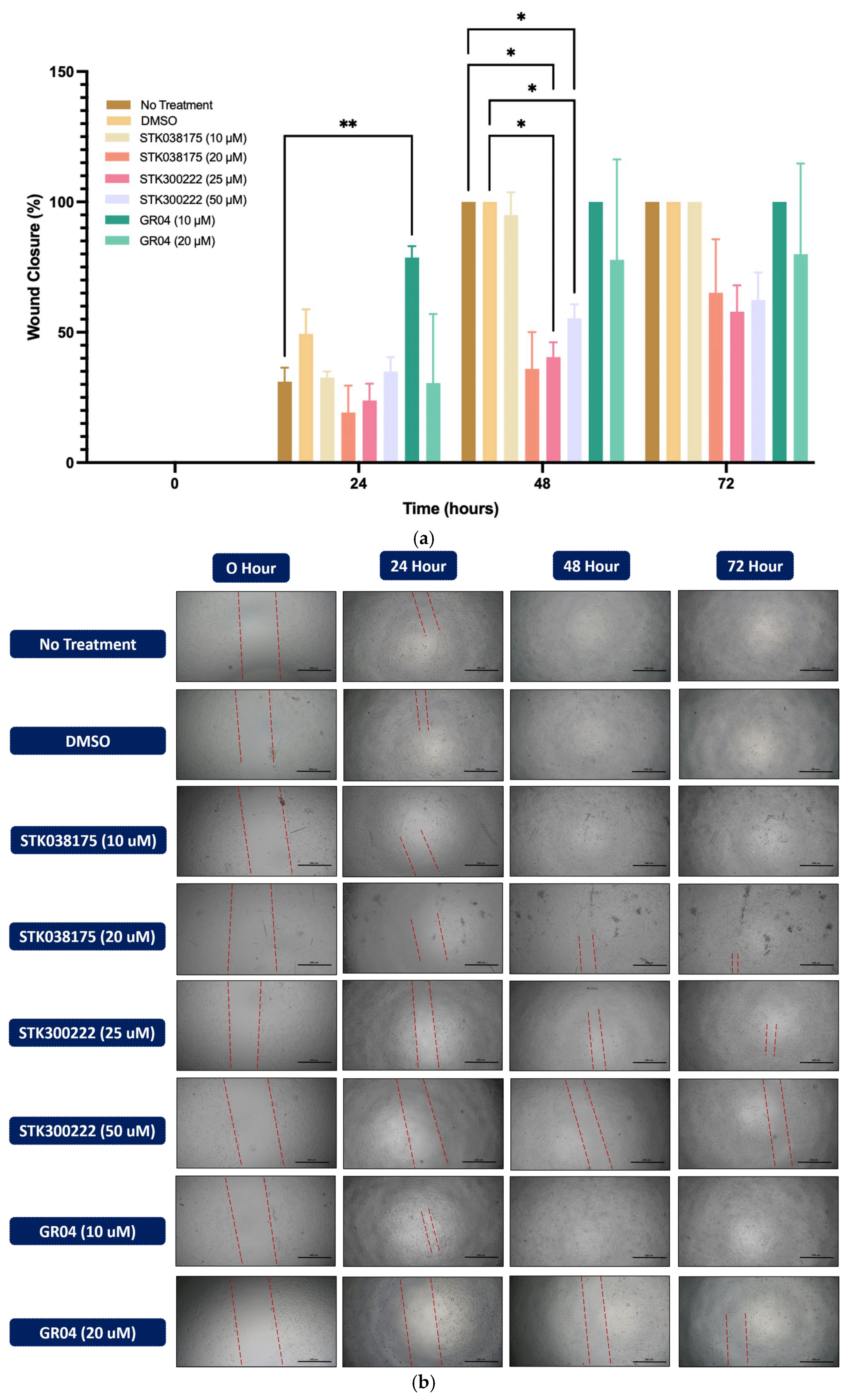 Figure 4) lung cancer cell lines. Cells were treated with DMSO as a control or various concentrations of STK038175 (10 µM and 20 µM), STK300222 (25 µM and 50 µM), and GR04 (10 µM and 20 µM). Wound closure was monitored at 0, 24, 48, and 72 h, and the percentage of wound closure was calculated relative to the initial wound size.