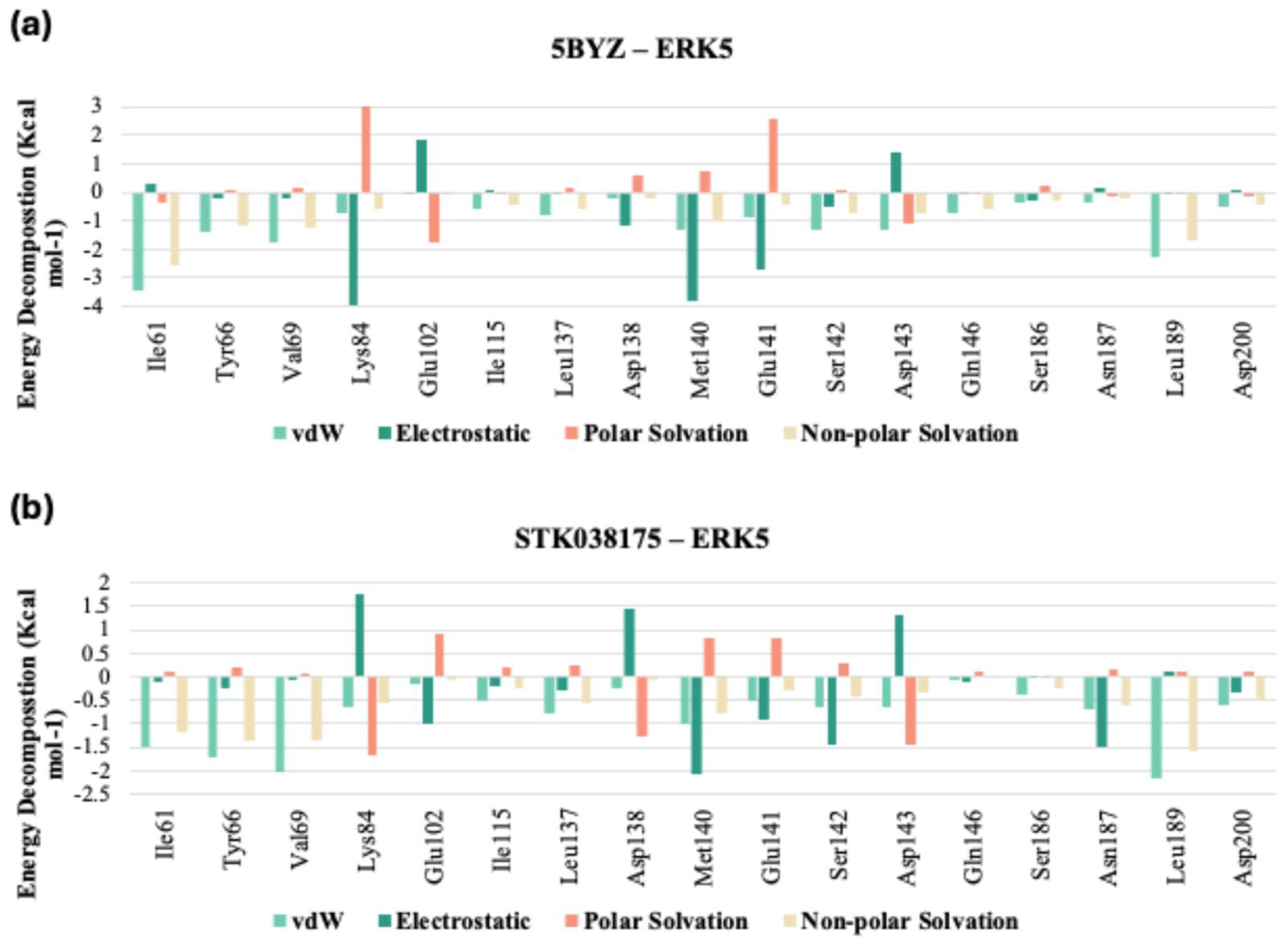 Tables S3 and S4 in Supplementary), which could explain its superior stability profile during the MD simulation. For example, at Leu137, both ligands displayed comparable van der Waals interactions, but STK038175 exhibited slightly stronger electrostatic attractions and a slight advantage in polar solvation. More pronounced differences were observed at Asp138, where STK038175 and the co-crystallized ligand exhibited similar van der Waals forces, yet their electrostatic interactions diverged, with STK038175 showing potential repulsion in contrast to the attractive forces of the co-crystallized ligand, which also excelled in polar solvation. Furthermore, at Met140, the co-crystallized ligand demonstrated stronger van der Waals and electrostatic interactions, suggesting a higher binding affinity. The positional adjustment of the co-crystallized ligand throughout the simulation may have facilitated these increased interactions with the hinge region residues, enhancing its binding dynamics.