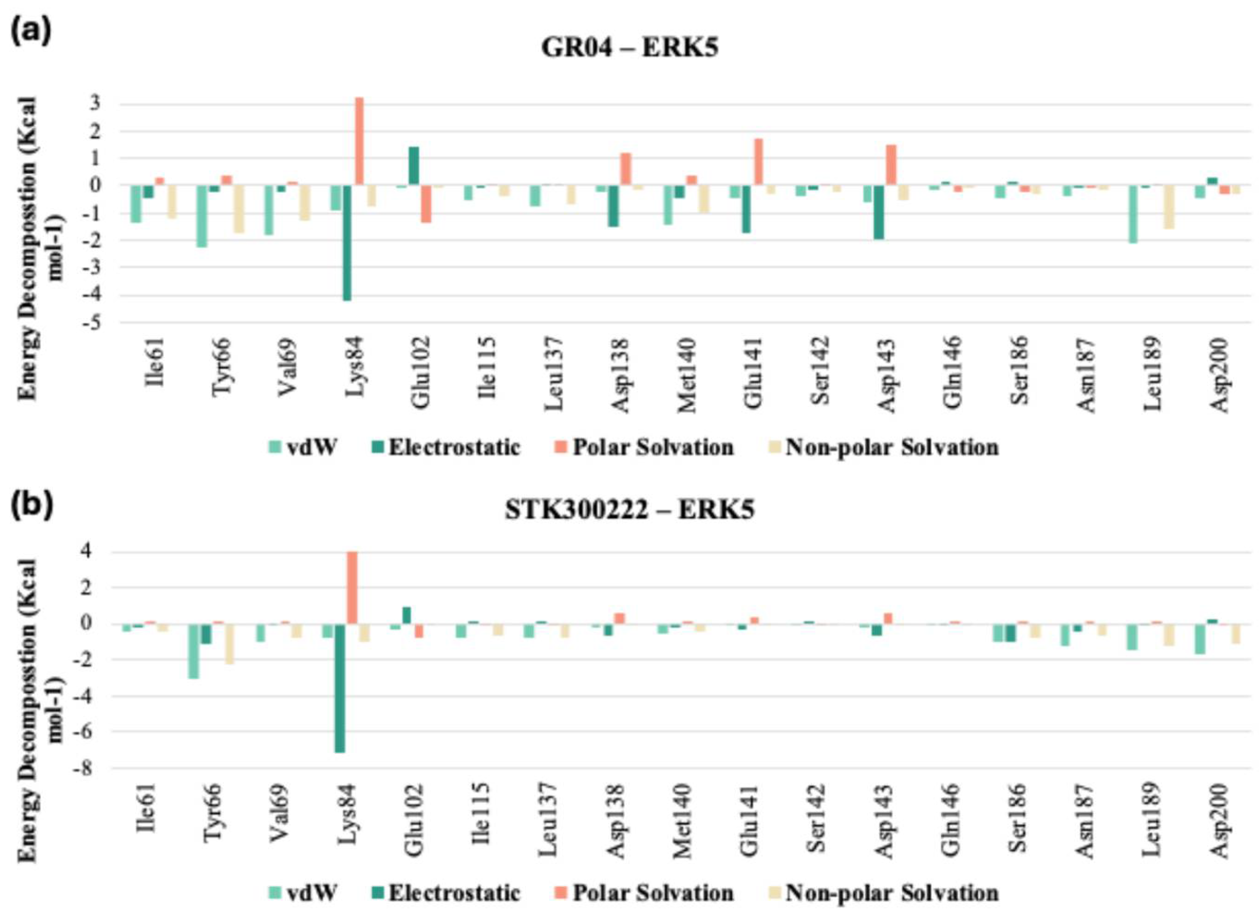 Tables S5 and S6 in Supplementary) with the cocrystalized ligand in 5BYZ, it is evident that both GR04 and STK300222 generally exhibit a weaker interaction profile with the hinge region residues compared to the cocrystalized ligand. Although these candidates may show reduced electrostatic repulsion and slightly improved solvation properties in some cases, their overall van der Waals and electrostatic interaction strengths are consistently weaker across most key residues, particularly Met140 and Glu141 for STK300222. This pattern suggests that while they may offer certain solvation advantages, their capacity to form strong, stable interactions with the hinge region of the protein is less favourable than that of 5BYZ, potentially impacting their effectiveness as inhibitors.