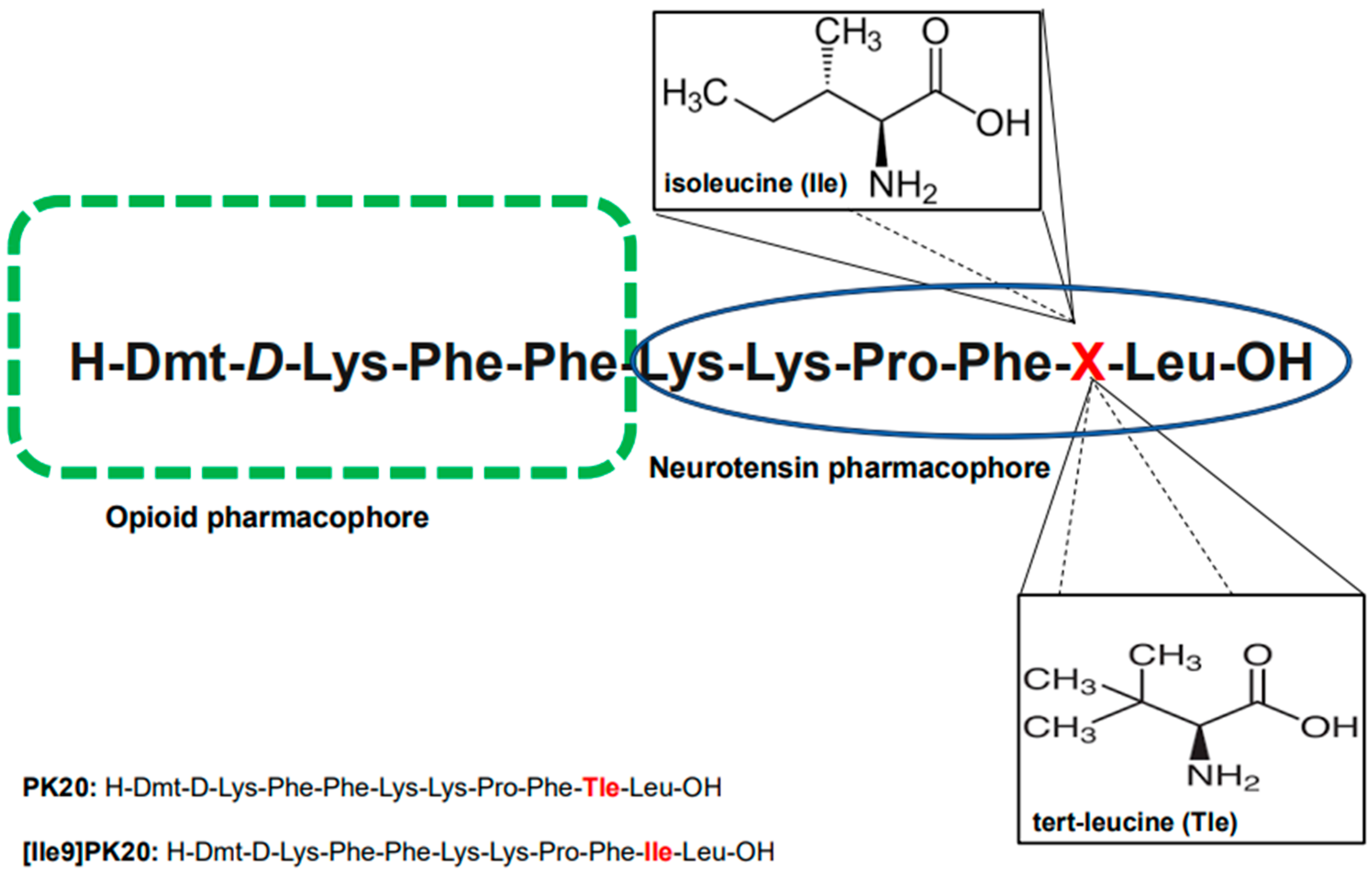 - Kleczkowska, P.; Kosson, P.; Ballet, S.; Van den Eynde, I.; Tsuda, Y.; Tourwé, D.; Lipkowski, A.W. PK20, a new opioid-neurotensin hybrid peptide that exhibits central and peripheral antinociceptive effects. Mol. Pain 2010, 6, 86. [Google Scholar] [CrossRef] [PubMed]
