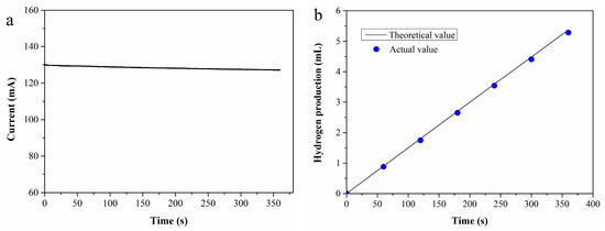 To evaluate the Faraday efficiency, an i-t test was performed at 70 °C using a 0.4 M Fe2+ standard solution as the anolyte, with the resulting i-t curve presented in Figure 1a. Based on the test data, the theoretical hydrogen production V0 (mL) can be calculated using Equation (4) [35]: