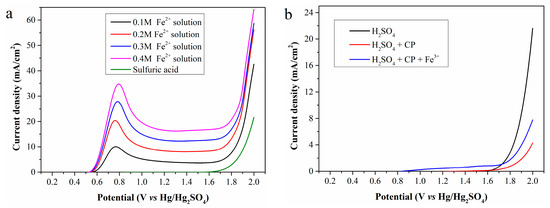 Using the standard Fe2+ solution (Fe2+ concentration: 0.1, 0.2, 0.3 and 0.4 mol/L, respectively) and 0.5 mol/L sulfuric acid as the anolyte, the LSV curves obtained with a scan rate of 10 mV/s and an anode potential range of 0.2–2.0 V (vs. Hg/Hg2SO4) is shown in Figure 2a.