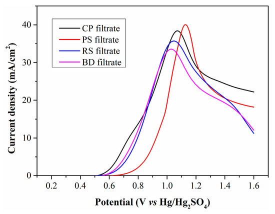 Figure 4 illustrates the LSV curves of the four filtrates. All curves exhibit a similar profile and an almost identical initial oxidation potential of 0.5 V (vs. Hg/Hg2SO4), which is attributed to the oxidation of Fe2+. The peak current densities for the filtrates produced by CP, RS, PS, and BD are calculated as 38.4, 35.6, 39.8 and 33.6 mA/cm2, respectively. The filtrates from CP and PS have higher Fe2+ concentrations than those from RS and BD, generating larger current densities. However, the PS filtrate exhibits significantly lower current density in the low anode potential range, suggesting that WSOCs formed by PS oxidation exert a more negative impact on Fe2+ electrooxidation.